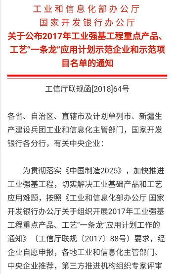 为贯彻落实《制造2025》,推进工业强基工程,切实解决工业基础产品和工艺应用难题,经企业申报、各地工信部门和央企推荐、专家评审以及公示等环节,工业和信息化部、开发银行日前确定了2017年工业强基工程“一条龙”应用计划示范企业48家和示范项目48个,并要求推动相关项目顺利实施。