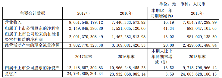 3月19日,巨石(600176.SH)发布《2017年年度报告》,显示报告期内,公司实现营业收入865,154.92万元,比上年同期增长16.19%;归属于上市公司股东的净利润214,984.94万元,比上年同期增长41.34%。具体数据如下: