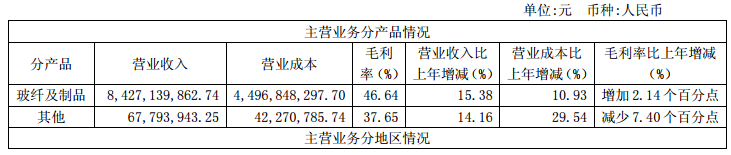 根据巨石年度报告,公司以实物销售为主的产品收入主要是玻纤纱及制品的销售。2017年公司玻纤纱及制品实现营业收入为842,713.99万元,占全部营业收入的比例为97.41%。与上年相比,玻纤纱及制品营业收入上升15.38%,营业成本上升10.93%,毛利率增加2.14个百分点。具体数据如下:
