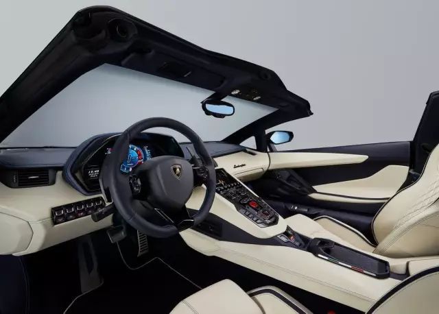 作为敞篷车型,这辆兰博基尼其采用了硬顶可拆卸式的碳纤维顶棚设计,重量仅为6公斤。后方发动机罩也可选装透明玻璃或黑色碳纤维百叶窗造型。