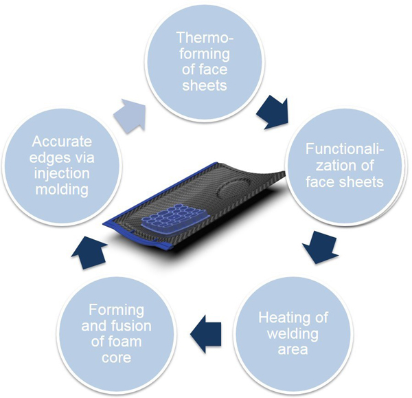项目简介:采用该技术制造复杂的2.5D结构热塑性夹芯复合材料具有较高的成本效益,生产周期非常短——对于航空航天材料而言,其周期时间短于5分钟;对于汽车材料而言,其周期时间短于2.5分钟。