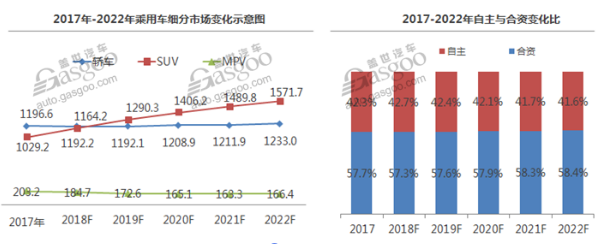 乘用车市场整体规模连年扩大,在车市话语权不断凸显,固然令人欣喜,尤其这背后还有很大一部分是自主品牌的功劳。不过,在3月22日由盖世汽车举办的“2018汽车产业发展趋势洞察”汽车人沙龙上,来自盖世汽车的产业分析师表示,未来5年车市将继续维持2017年的微增长,复合增长率大约保持在4.2%,增长动力以SUV为主。并且在2019年,SUV市场销量将超过轿车市场销量,成为大单一细分市场。不仅如此,受益于市场消费主体和消费方式的变化,未来几年新能源汽车和智能网联汽车消费需求将进一步得到释放,步入发展新阶段。