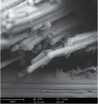 图1:碳纤维增强聚丙烯复合材料破坏后断面电子显微镜照片