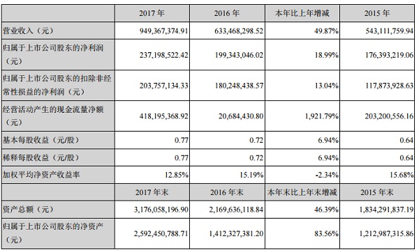 4月2日晚间,光威复材(300699.SZ)发布《2017年年度报告》,显示2017年公司实现营业收入9.49亿元,较上一年增长49.87%;实现归属于上市公司股东的净利润2.37亿元,较上一年增长18.99%。具体数据如下: