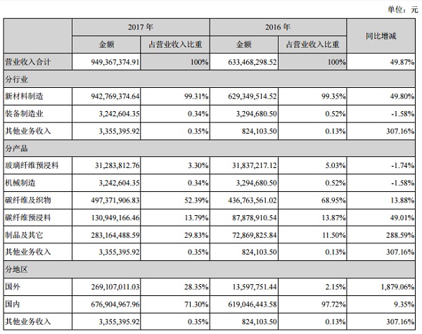 光威复材:2017年碳纤维及织物收入达4.97亿元