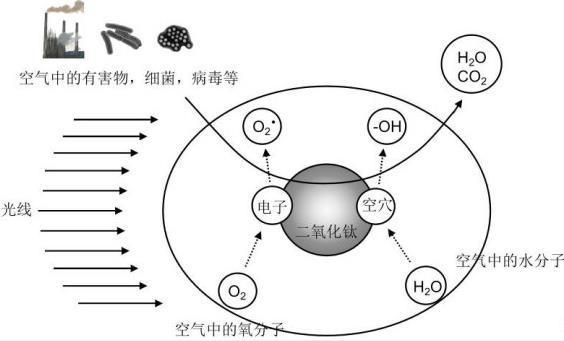 (4)车内空气净化材料 由于车内长期不通风,加上各种装饰材料和各种家用化学物质的使用,车内空气污染的程度越来越严重。车内有害气体主要有装饰材料等释放的甲醛及生活环境中产生的甲硫醇、硫化氢、氨气以及各类臭气等。据有关部门测试,车内空气中挥发性有机化合物高达300多种,其中对人体容易造成伤害、甚至致癌的就有20多种,极大地威胁着人类的健康生活。随着人们健康和环保意识的增强,人们对具有光催化净化室内空气、抗菌杀毒等功能性绿色环保材料的需求日益迫切,纳米二氧化钛光触媒的出现为环境净化材料的发展开辟了一片新天地,也为人们对健康环境需求的解决提供了有效的途径。 上能作为光触媒的材料众多,包括二氧化钛、氧化锌、氧化锡、二氧化锆、硫化镉等多种氧化物硫化物半导体,其中二氧化钛因其氧化能力强,化学性质稳定无毒,成为上当红的纳米光触媒材料。二氧化钛的禁带宽度约为3.0eV,属于紫外光激发范围,因此在应用上须以紫外光为光源,才能具有光催化作用。二氧化钛的粒径大小亦会影响光触媒功能,二氧化钛粒径大小须在5~30纳米范围内,才具有较好的光催化活性,佳的粒径大小约为7纳米左右。利用光触媒材料经紫外光线激发后,进而活化空气中的水气分子或氧气分子形成氢氧自由基或负氧离子,进行氧化或还原作用,以分解环境中的污染物,即可应用于去除空气中或废水中的污染物,亦可应用于抑制或灭除附着于表面的细菌,达到抗菌效果。 纳米光触媒在光照下,自身不发生化学变化,却可以促进化学反应的物质,其功能就象光合作用中的叶绿素。当其吸收太阳光或其他光源中的能量后,粒子表面的电子被激活,逸离原来的轨道,同时表面生成带正电的空穴。逸出的电子具有强还原性,空穴则具有强氧化性,两者与空气中的水气反应后会生成活性氧和氢氧自由基。活性氧、氢氧自由基能将大部分有机物、污染物、臭气、细菌等氧化分解成无害的二氧化碳和水。