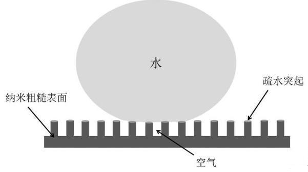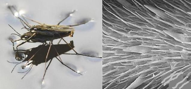 水黾在水上稳定站立、快速行走归功于腿部特殊的微纳结合的结构效应。在高倍显微镜下观察发现,水黾腿部有数千根按同一方向排列的多层直径不足3 微米的刚毛,这些刚毛表面形成螺旋状的纳米沟槽,吸附在沟槽中的气泡形成气垫,从而让水黾能够在水面上自由地穿梭。其原理见下图。