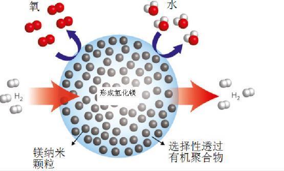 (6)储氢材料 随着人类对可再生能源的重视程度越来越高,氢能作为一种绿色清洁能源具有广阔的发展前景。目前,限制氢作为燃料用于工业和人类生活中的难点主要是在氢的发生、储存和运输等方面还存在问题。科学家们已根据氢的物理化学特性研究得知,若使储氢材料具有实用价值,必须具备以下特性:储氢含量高,具有高度的反应可逆性,且可在常温常压下进行;具有良好的循环性,而且循环的次数要足够多;易活化、滞后效应小;具有优良的抗毒性能。此外,在研究设计时还应注意要尽量满足比重小、能量密度高、制造工艺简单、安全等特性。由于目前人类科学技术水平的限制,还未能发现能同时满足上述多数条件的储氢材料,因而其应用也受到了很多限制。 20世纪60年代,材料王国里出现了能储存氢的金属和合金,统称为储氢合金,这些金属或合金具有很强的捕捉氢的能力,它可以在一定的温度和压力条件下,氢分子在合金(或金属)中先分解成单个的原子,而这些氢原子便''见缝插针''般地进入合金原子之间的缝隙中,并与合金进行化学反应生成金属氢化物,外在表现为大量''吸收''氢气,同时放出大量热量。而当对这些金属氢化物进行加热时,它们又会发生分解反应,氢原子又能结合成氢分子释放出来,而且伴随有明显的吸热效应。别看储氢合金的金属原子之间缝隙不大,但储氢本领却比氢气瓶的本领可大了。具体来说,相当于储氢钢瓶重量1/3的储氢合金,其体积不到钢瓶体积的1/10,但储氢量却是相同温度和压力条件下气态氢的1000倍。 迄今为止,在已发展的稀土金属系(AB5型)、钛系(AB型)、锆系(AB2型)和镁系(A2B型)储氢合金中,镁系合金是很有发展前途的一种。镁基合金储氢原理是氢气吸收过程中镁纳米颗粒与氢气相互作用,形成氢化镁;氢气释放过程中,氢化镁分解成镁与氢气。但是金属镁化学性质非常活泼,容易与水和氧气发生化学反应,从而使得储氢效率变得极低。为了解决这个问题,2011年美国劳伦斯伯克力实验室开发了一种新技术,研究人员用一种选择性透过有机聚合物将镁纳米颗粒包裹起来,这种有机聚合物的特点是能选择性地让氢气分子自由进出,而将氧气和水分子隔绝在外(图3-8)。研究结果表明,该技术无需使用重金属做催化剂,且储氢密度较高(氢气重量能达到总重量的4%),冲入氢气的速度较快(能在200°C条件下,在30分钟内充满)。