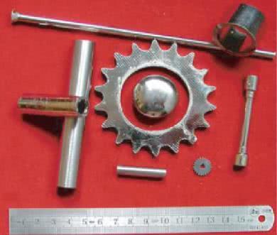 (7)金属玻璃 研究人员发现,当对液态金属快速冷却,即金属的原子还没有时间排列整齐就冷却成固体了,这样形成的金属材料称之为金属玻璃。如果说钢铁等晶态固体的原子排序好比列队整齐的阅兵式阵列,那么玻璃等非晶态固体的原子排序就像是王府井大街上熙熙攘攘的人群。 1960年加州理工学院的科学家们先发现了金属玻璃(又称非晶合金),金属玻璃既有金属和玻璃的优点,又克服了它们各自的弊病(玻璃易碎,没有延展性,而金属硬度和耐磨损性能不佳)。金属玻璃兼有玻璃、金属、固体和液体的某些特性.比如:金属玻璃是迄今为止强的材料之一,一根直径4mm 粗的金属玻璃丝可以悬吊起3吨的重物;将它浸在强酸、强碱性液体中,仍能完好无损;具有接近陶瓷的硬度却在一定温度下能像橡皮泥那样的柔软、像液体那样流动。 由于金属玻璃的形成需要大于106K/秒的冷却速率,使得形成的合金呈很薄的条带或细丝状,因而限制了这类材料的应用范围,同时也影响了对其许多性能进行系统、精确的研究.寻求具有很强玻璃形成能力,大块状金属玻璃一直是非晶物理和材料领域科学家们追求的目标,并为此做出了艰苦的努力。由于大块金属玻璃具有耐磨、抗疲劳、抗腐蚀等优良的性质,在汽车发动机、传动系统等具有广阔的应用前景。下图为科学院物理研究所研制的大块金属玻璃的照片。