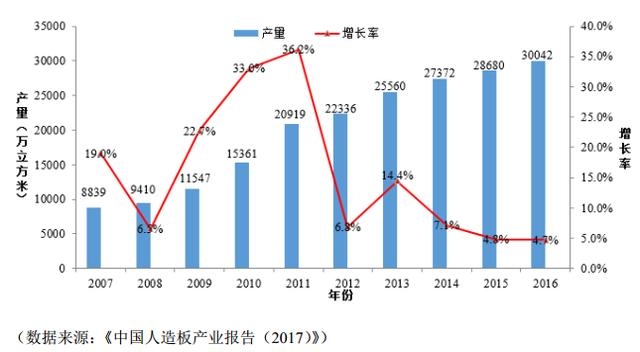 图表1 2007-2016年人造板产量与增长率