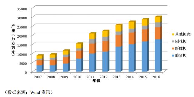 按照原料及生产工艺不同,人造板可分为纤维板、胶合板、刨花板、细木工板等品种,其中纤维板、胶合板、刨花板为市场三大主流人造板,2011年-2016年数据合计产量占人造板总产量的85%以上。