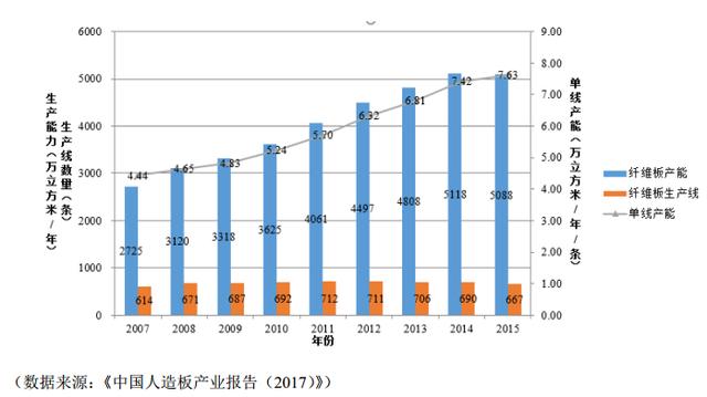 相对胶合板和刨花板而言,由于纤维板生产发展较早、技术相对成熟,纤维板行业的自动化程度相对较高。数据显示,随着我国纤维板生产制造设备的自动化程度提高,2016年,纤维板制造企业的年平均产能已达10万立方米。同时,单条纤维板生产线的平均产能也由2007年的4.44万立方米/年增长至2016年的8.51万立方米/年,呈现规模经济效应。