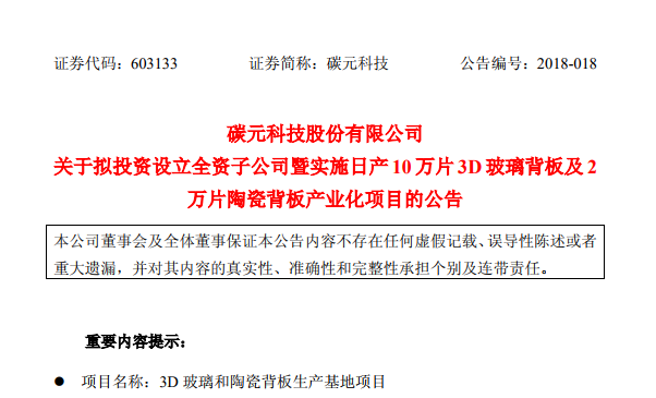 预计投资10亿元!碳元科技拟设子公司建3D玻璃、陶瓷背板研发生产基地