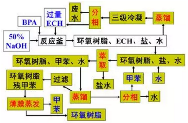 一步法 ( 国外称Taffy法)可分为水洗法、溶剂萃取法和溶剂法,是将双酚A和环氧氯丙烷在NaOH作用下进行缩聚反应,用于制造中等分子量的固态环氧树脂,国内生产的 E-20、E-14、E-12等环氧树脂基本上均采用此法。