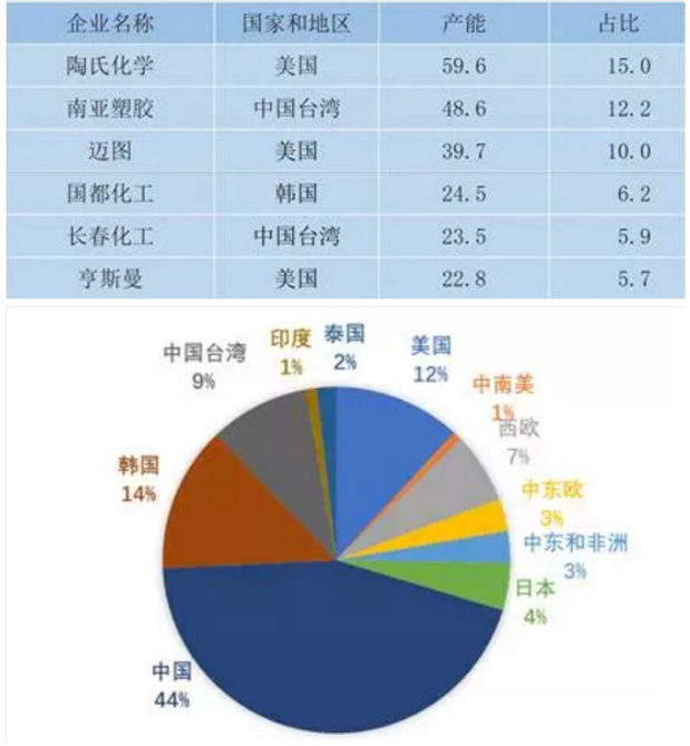 2016年环氧树脂总产能约为462万t/a。近年,环氧树脂企业兼并及投资活动较为活跃,经过一系列的兼并重组,目前环氧树脂企业的前三甲为陶氏化学(陶氏进行资产重组,将环氧树脂业务卖给了Olin,获得Olin 50.5%股权)、台湾南亚塑胶和迈图特种化学其产能分别占总产能的15%、12%和10%。国外主要环氧树脂生产企业产能见表2,各地区产能分布情况见图3。