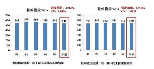 2016年1月,宁波材料所在国内率先实现了国产M55J制备技术重大突破,同年9月进行了制备技术验证,并获得拉伸强度4.15GPa、拉伸模量585GPa的高强高模碳纤维,后续进一步成功实现了国产M55J高强高模碳纤维连续稳定生产,纤维主体性能批间批内离散系数远<5%。随后,针对国产高强高模碳纤维工艺分析、结构研究、性能优化开展了详细研究,尤其是重点开展高温石墨化环境中碳纤维拉伸强度保留率研究工作,近期成功制备拉伸强度5.24GPa、拉伸模量593GPa的高强高模碳纤维,与日本东丽M60J高强高模碳纤维(拉伸强度3.92GPa、拉伸模量588GPa)相比,继续保持了拉伸强度上的优势。