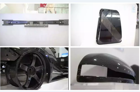 图为康得复材设计的车顶中横梁(左上)、Surface-RTM展示件(右上)、碳纤维轮毂(左下)、汽车装饰件(右下)