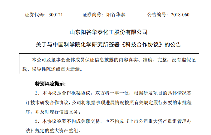 5月7日晚间,阳谷华泰(300121.SZ)发布公告表示,公司与科学院化学研究所在新材料相关技术的研发和产业化等方面进行了充分研讨,经友好协商,双方同意开展新型氧化物陶瓷连续纤维等新材料的长期合作,并于2018年5月2日签署了《科技合作协议》。