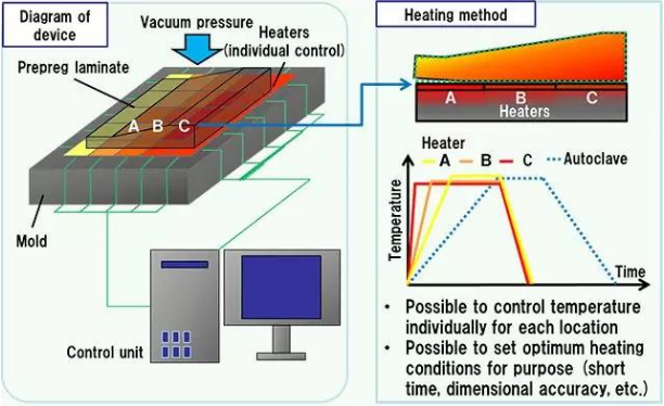 在CFRP的制造中,通常采用一种热压罐(高温高压炉)或一种加热炉。将预浸料(一种片状的中间材料)放到预定形状的模具上,利用热空气使预浸料中的树脂固化。