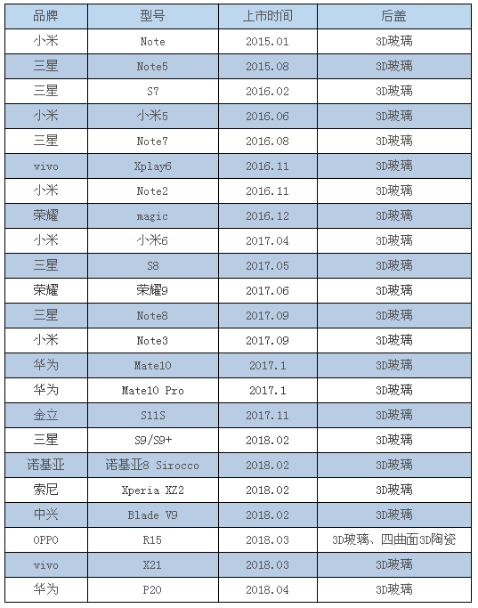 单看这一数字可能看不出太多内容,但对比2015—2017年,市场上发布的3D玻璃后盖手机数量分别是2、10和13,可以明显看出,3D玻璃后盖已成手机发展趋势,其市场渗透率将快速提升。
