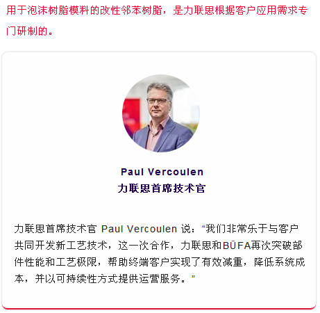 BÜFA公司与力联思紧密合作,共同优化了树脂的合成和固化特性。“力联思在树脂化学和产品性能开发有丰富的经验,我们共同优化树脂体系,使部件达到了预期要求。”BÜFA 的商务总监LotharKempf说,“力联思的树脂性能高度稳定一致,令客户制造工艺稳健可靠,这一点对于客户非常重要。”