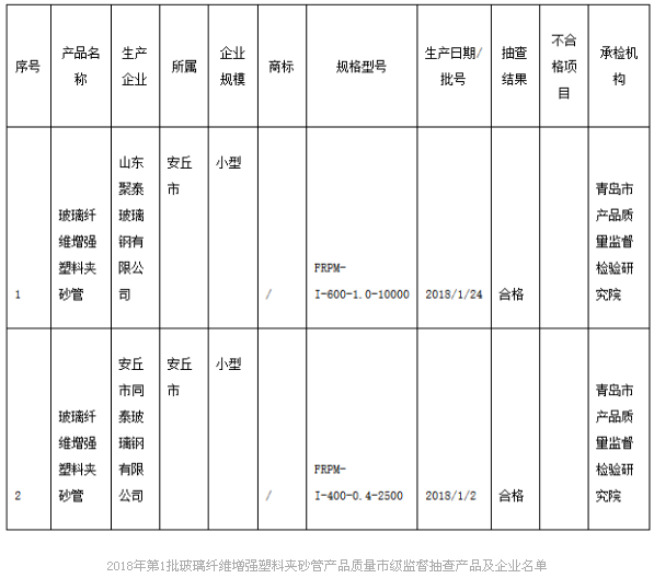 2018年第1批玻璃纤维增强塑料夹砂管产品质量市级监督抽查产品及企业名单