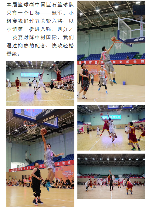 十年前,建筑材料集团有限公司届男子篮球赛,就在巨石本部进行。那一年作为东道主,巨石以独特的企业文化给兄弟单位留下了深刻的印象,为人津津乐道。十年间,巨石篮球队的小伙子们五次组队参赛,三次闯进决赛,可惜都与冠军失之交臂,但是我们从没有放弃对冠军的渴望,2017年我们早早组建新一届篮球队,通过公司级联赛、“巨石杯”三地篮球赛、桐乡市周末联赛、篮协杯以赛代练,磨合队伍。