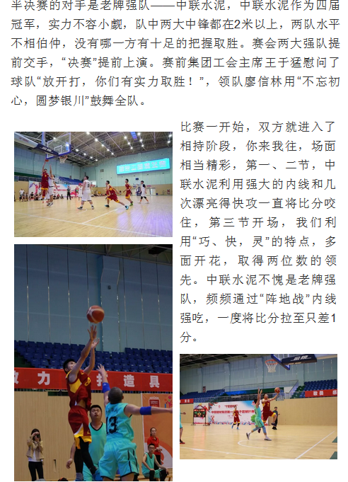 5月26日,在庄严的国歌声中,由建材集团主办、宁夏建材集团承办的建材集团届男子篮球赛(宁夏建材杯)在宁夏银川胜利闭幕。本届篮球赛是“两材重组”后新集团组织的届男子篮球比赛,意义非凡。来自20支代表队的288名运动员、教练员参赛,经过6天的紧张角逐,巨石篮球队圆梦银川,问鼎冠军。