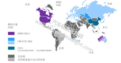 汽车车窗玻璃作为汽车重要的安全部件,其安全性能尤为重要,因此作为新材料的聚碳酸酯(PC)应用于汽车车窗上应满足相应法规要求。塑料车窗法规应用情况如图2。