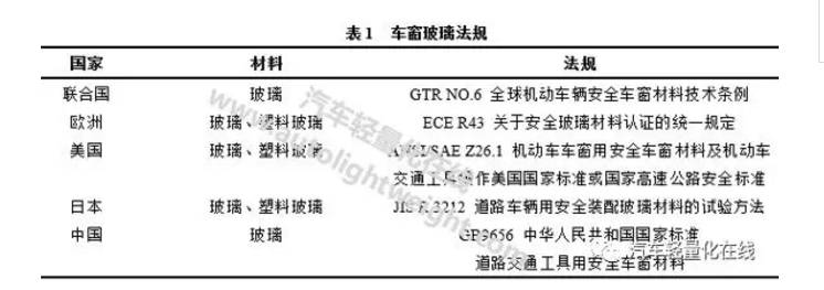 联合国法规《机动车辆安全车窗材料技术条例》(GTR NO.6)的优点是统一测试标准,但缺点是仅限于无机玻璃。随着汽车技术的发展,欧洲、美国及日本完善了车窗法规,增加了对塑料玻璃的要求,但也不是很全面,如对光畸变、光稳定性等未作要求,但毕竟在塑料玻璃标准方面迈出了重要一步。目前车窗法规《道路交通工具用安全车窗材料》(GB9656)只对传统无机玻璃有要求,对于塑料玻璃要求还是空白,急需制定和完善。车窗玻璃法规见下表1。