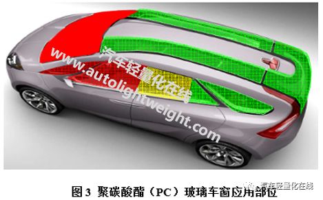 根据欧洲、美国及日本的标准,从整车安全角度考虑,由于有事故逃生的需求,聚碳酸酯(PC)材料不能应用于前风挡玻璃窗和B柱前的侧窗。B柱后的侧窗没有禁止,但目前还没有成功的应用案例。后三角窗、后风挡玻璃窗、层叠式天窗和全景天窗是目前主要的应用部位,见右图3。