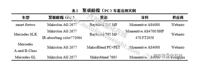 美国Sabic-IP公司指出,采用聚碳酸酯(PC),可以革新车窗的设计和安装位置以及开启车窗的机械系统,加上聚碳酸酯(PC)重量比玻璃轻,而且在发生碰撞事故时不会伤及人员等优点,因此推广应用前景极好。据专家估计,未来10年内,新型聚碳酸酯(PC)汽车车窗玻璃将形成50~60亿美元的市场。如今,聚碳酸酯(PC)在汽车全景天窗、后风挡玻璃、侧窗以及车身上那些有深色玻璃质感的配件方面有着显著的发展。聚碳酸酯(PC)车窗应用实例见表2。