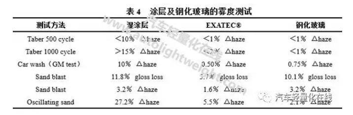 注塑成型聚碳酸酯(PC)车窗是一项新生技术,但由于聚碳酸酯(PC)抗UV性和耐化学性差且易被刮擦,因此需要在聚碳酸酯(PC)表面增加涂层以保证车窗的优异耐候及耐刮擦性能。1998年,为了针对该市场开发专用涂层,由Bayer和sabic(原GE塑料)各自出资50%组建了Exatec公司。Exatec公司提供了一种特殊湿涂层和等离子硬质涂层系统,通过在聚碳酸酯(PC)上先使用防UV涂层作为底漆,然后使用化学辅助气相沉积法创造出了抗刮擦涂层,这种方法称为Exatec900系统,这种涂层能保证即使暴露于气候环境中10年多其性能仍然稳定。Exatec900系列通过了Taber磨损试验,雾度低于2%,见下表4。