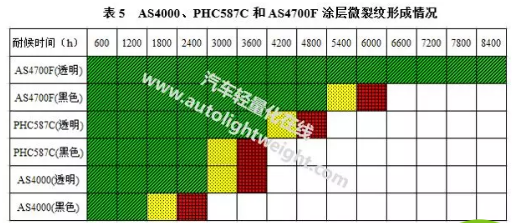 在工业实践中,迈图公司的AS4000、PHC587C以及AS4700F涂层系统应用于聚碳酸酯(PC)车窗已经被广泛认同(如:Smartfortwo、Mercedes SLK 的天窗涂层),这些涂层能够满足汽车工业的要求,并且已经证明它们本身在实际使用中的长期稳定性。迈图公司就常用涂层系统在黑色和透明聚碳酸酯(PC)板上进行试验,验证涂层微裂纹形成情况,测试条件:ASTM G 155 mod耐候测试方法1100小时,相当于1年福罗里达州暴晒照射量,测试结果如下表5所示。