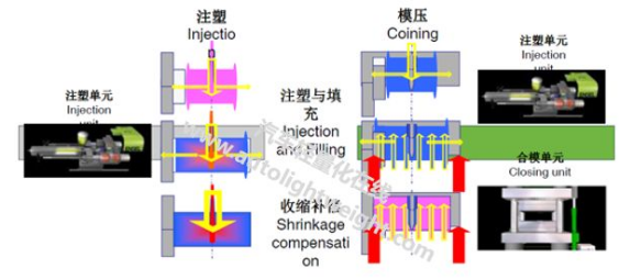 聚碳酸酯(PC)车窗玻璃由于表面积较大,玻璃上的残余应力会破坏光学质量和涂层质量,也会导致涂层起雾或分层,因此为了保证光学质量和硬质涂层,聚碳酸酯(PC)车窗玻璃必须在低压下成型。因此取代传统注塑成型方法的模压-注塑方法是制造低应力、大型聚碳酸酯(PC)车窗玻璃的理想工艺。典型的模压-注塑成型法的压力大约是21~24MPa,而模压-注塑法生产聚碳酸酯(PC)车窗玻璃的压力是18~20MPa。模压-注塑工艺见图4。