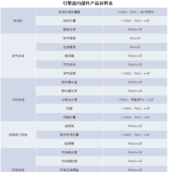 引擎盖内塑料按材料分,主要有聚酰胺材料(PA6-30%,PA66-22%)、聚丙烯材料(46%)和其他材料(2%)(PPS,PEI等)。按应用部件分,主要有进气歧管(17%)、发动机盖(10%)、散热器箱(8%)、前端组件(7%)、汽车摇臂盖(14%)、风扇/护套(11%)和引擎盖内其他部件(33%)。