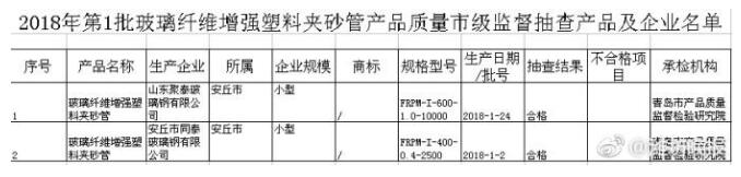 2018年第1批玻璃纤维增强塑料夹砂管产品质量市级监督抽查结果