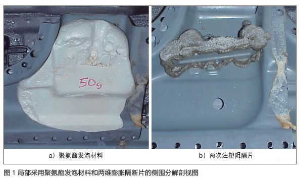 因此,相比较目前空腔填充较多应用的两次注塑膨胀隔断片,聚氨酯发泡材料不仅具有三维膨胀可靠封阻的优点,更具有前者所不具备的良好的吸声特性,使之在抑制噪声通过空气传播途径中显示出优异的表现。图1所示为局部采用聚氨酯发泡材料和两维膨胀隔断片的侧围分解剖视图。