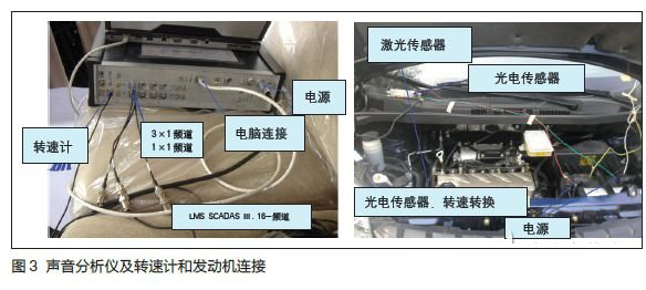 本试验的测试目的主要是测量被测车辆的车内噪声特性,并对比同一车辆内部噪声声压等级情况(旁路空腔处理前后),从而考查旁路空腔封阻对承载型车身(单元化车体)车辆车内噪声的影响。测试设备如图3所示。整车在3处放置麦克风传声器:驾驶座外侧、副驾驶座外侧和后座中间,设定位置如图4所示。每个车辆工况下各个循环进行10s的信号采集,每个工况测量4~5次循环,保留3组较一致的数据信号。