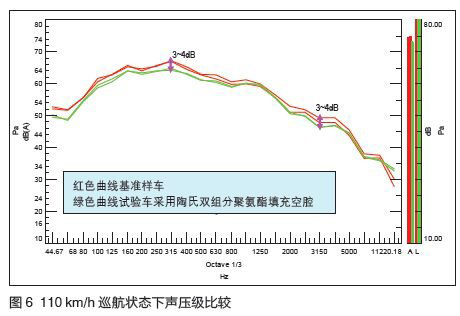 如图6所示,在110km/h巡航状态下,可以看出从采用陶氏双组份聚氨酯发泡材料填充空腔的试验车采集的数据(绿色曲线),比基准样车(红色曲线)的频域声压级低3~4dB。