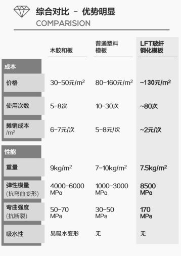 中模国际推出的玻纤复合模板性能优良,周转次数高、安装便捷、单价便宜,无论在性能还是价格方面都具有明显的优势。和其他模板相比,玻纤复合模板不会像木模板吸水易变形,也不会像钢模板那样笨重难施工,玻纤复合模板综合性能更优,而且单次使用费用(130元/m2)低于钢模板、铝模板价格,成本优势明显。