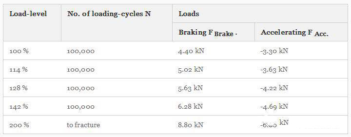在常规道路使用中,控制臂在几个方向上受到随机载荷。为了在单轴试验中获得相同的损伤,设计了一种与损伤等效的加载方式。施加的减速度为4.4 kN,加速度为-3.3 kN,施加100,000次循环。 一旦达到该循环次数而没有可见或可测量的部件损坏,则在增加的负载下应用另外100,000次循环。这在表1中描述。