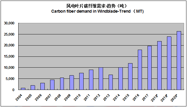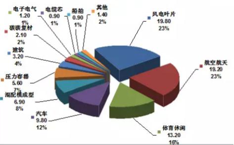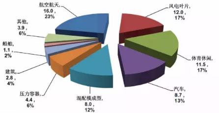 根据Composites Forecasts and Consulting的统计报告,2016年,风电用高性能碳纤维复合材料用量已经超航空航天领域,占到全年用量(76500 吨)的23 %,成为用量大的领域。