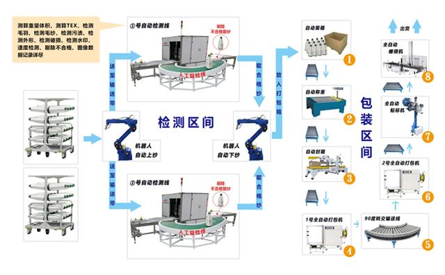 智能全自动管纱外观检测及包装线是以“HDGS-I型管纱外观自动检测系统”为核心,配套自动上纱机器人、自动下纱机器人、自动包装线等环节构成。生产完全自动化,能满足客户稳定、安全、高质量的生产要求。