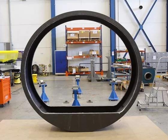 步骤3:碳环铺放完成后,由搬运机器人送入下一个工作平台,包入真空袋,做灌注树脂、加热固化前的准备工作。碳环两侧圆形截面底部的垂直面板,是元件“地板”的支撑结构。