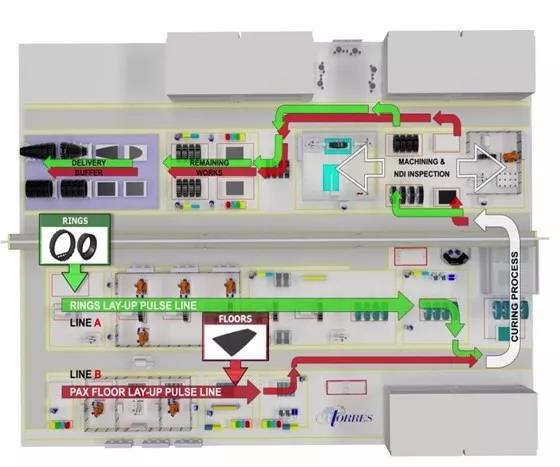 特别需要注意的是,在每个碳环的两侧圆形截面底部,还分别铺放出一块竖立的面板(步骤3),作为另一种“元件”——地板的支撑结构。然后,技术人员将碳环包入真空袋,安装树脂导流管,再由机器人送入下一个作业平台,在技术人员监督下进行树脂灌注的真空作业。