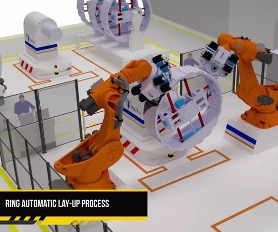 整个工艺的阶段从生产“元件”开始。“碳环”和“地板”两条生产线平行设置(步骤1),“碳环”生产线中,作业机器人将环状金属芯轴(按客户尺寸/形状要求定制)交付给配备可旋转头部的搬运机器人(positioning robot)。搬运机器人将芯轴送入下一个作业平台。两台作业机器人分别侍立于平台两侧,机械手臂上装配有MTorres自动铺丝头,将干碳带快速铺放于带凹槽的芯轴外表面。干碳带的铺放可以按0°, 90° 和 ±45°角度进行,也可以针对不同的应用需求进行优化和调整。其中所使用的干碳带是MTorres为这种新工艺专门研发的。碳纤维原材料来自一家业内的知名企业,MTorres向其中添加了一种热塑性粘合剂,既是为了在铺丝过程中赋予碳带一些粘性,也是为了帮助后续树脂灌注的顺利进行。