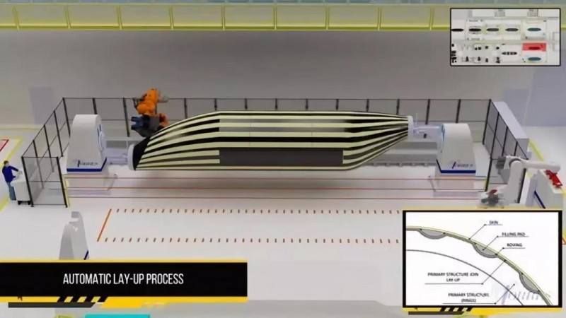 步骤11:上图是生产样机时,铺设外蒙皮的实景图。实际生产过程中还会加入黄铜用于避雷。经过覆膜、送入真空袋、灌注树脂、加热固化之后,机器人对在机身表面切割出门窗。