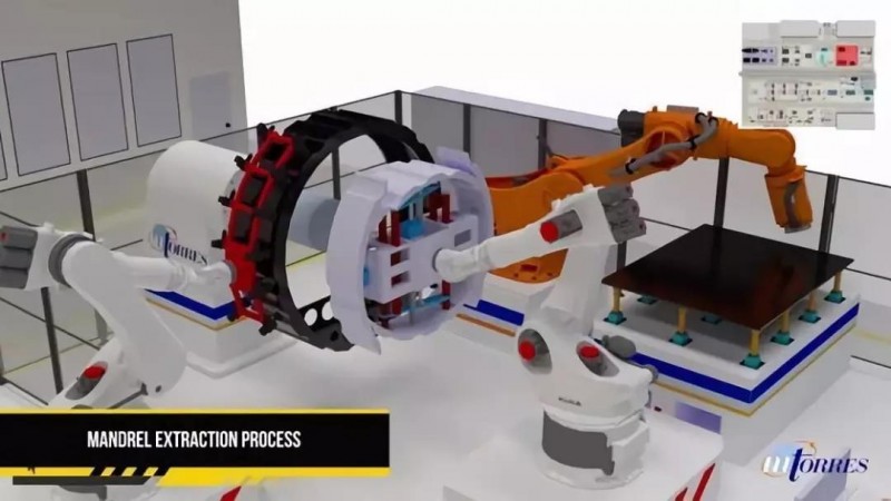 步骤2:以在金属芯轴上自动铺丝的方式生产元件“碳环”。芯轴固定在一台搬运机器人上,另两台作业机器人协同铺丝,以减少铺放时间。碳环上留有的凹槽,是为了在后组装环节时,扮演飞机纵梁的角色。