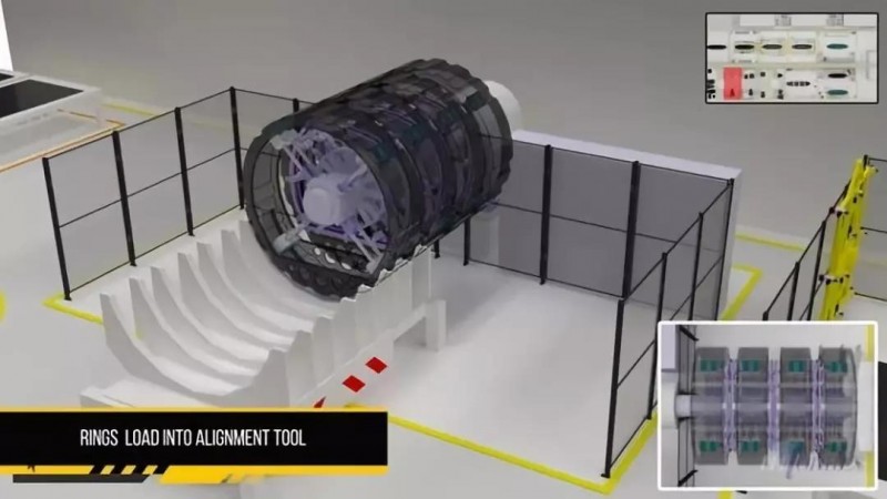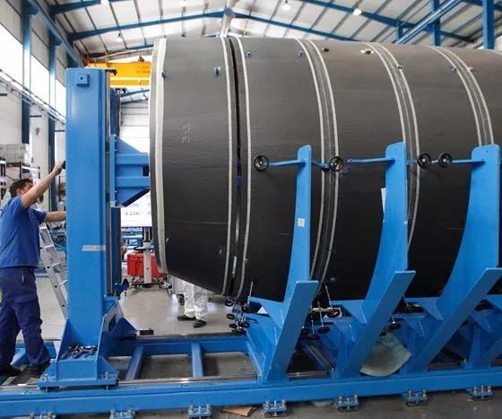 步骤9:上图显示的是,各筒体结构(包括机头和机尾)被嵌入一台更大的工装,接受位置校准和上胶作业,并压实形成完整的机身结构件。